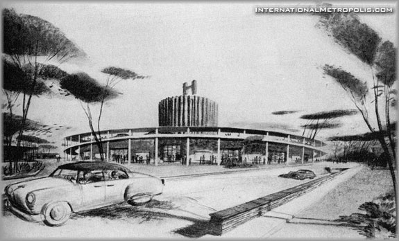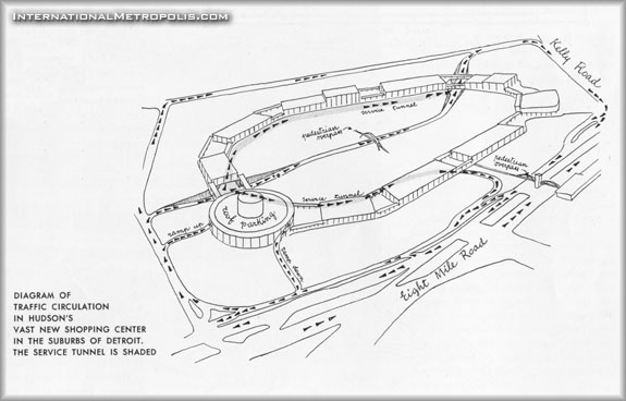 Traffic control. Pedestrian and automobile traffic is kept separate, except where they encroach upon each other in the parking areas. Illustrated above is the pedestrian overpass by the side of J.L. Hudson’s circular store. In the background is that store’s roof parking reached by circling ramps. In the foreground is the depressed roadway which carries automobile traffic entering the center. Trucks enter by this same road but are diverted at this point into one of the two freight tunnels, which serve the major stores on each side of the oval. All traffic, except pedestrians, circles in a one way pattern.