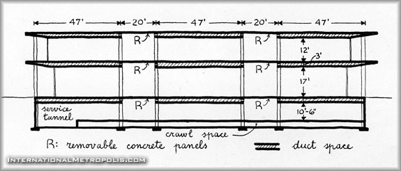 The store buildings, if they follow the architect’s suggestions, will be of standard construction, yet still retain an ingenious flexibility. Of reinforced concrete construction, there will be 20 ft. bays with removable panels, so that vertical connections between floors – Stairs, elevators, or escalators – can be easily installed if a tenant wishes. The first floor height of 17 ft. gives space enough for a mezzanine if required. The 3 ft. space between the two floors will accommodate all duct work. Freight handling is confined to the service tunnel which connects wither the basement of each store. consequently all four sides of each store building may be selling front with large display windows.