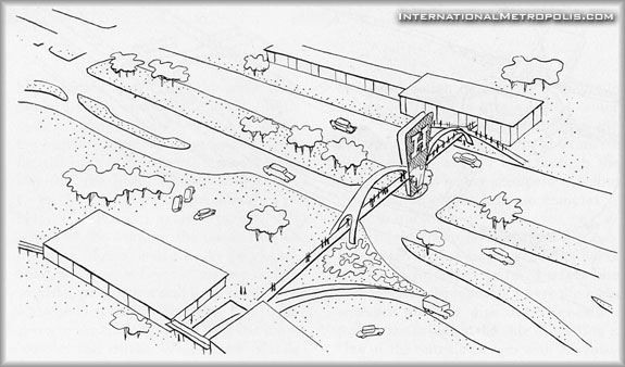 A pedestrian overpass crosses Eight Mile Road to a proposed bus stop. With its flaring concrete arches and its tall central pylon, this bridge doubles as an impressive signboard, bringing J.L. Hudson’s new center to the notice of motorists passing along the highway.