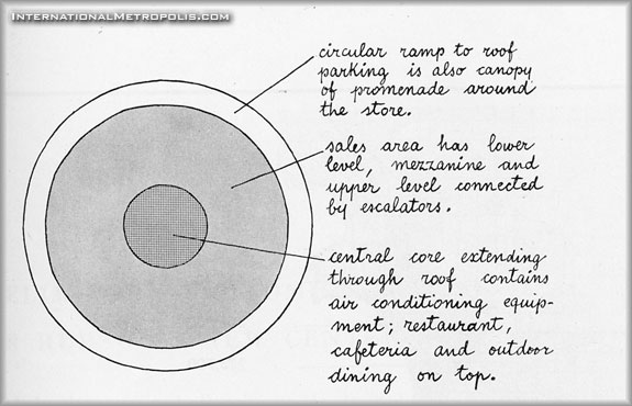 The department store, off on its own comparatively cheap land in the suburbs, is no longer hemmed into the stern rectangular shape imposed by downtown city blocks and high land values. It is perhaps significant that, given this new freedom of choice, several department stores have chosen a circular shape. If it is also made windowless, as this one for J.L. Hudson, all stock rooms can be kept to the periphery, where two encircling one way ramps lead to and from the roof parking.