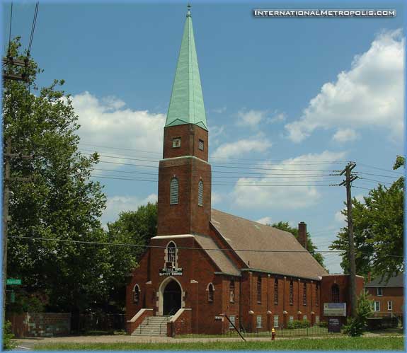 Chuck, I’ve done a little research for you, and here’s what I’ve come up with. It looks like the church was built after 1923, and when it was built it was know as the Hungarian Reformed Church. There was a 4 car garage on the rear of the property. The building is described in the Fire insurance reports as Wood Floors on steel joists, steel trusses, cinder blocks with brick facing. The spire is 78′ tall. It was sold to Peter’s Rock December 1, 1989 for $35,000.